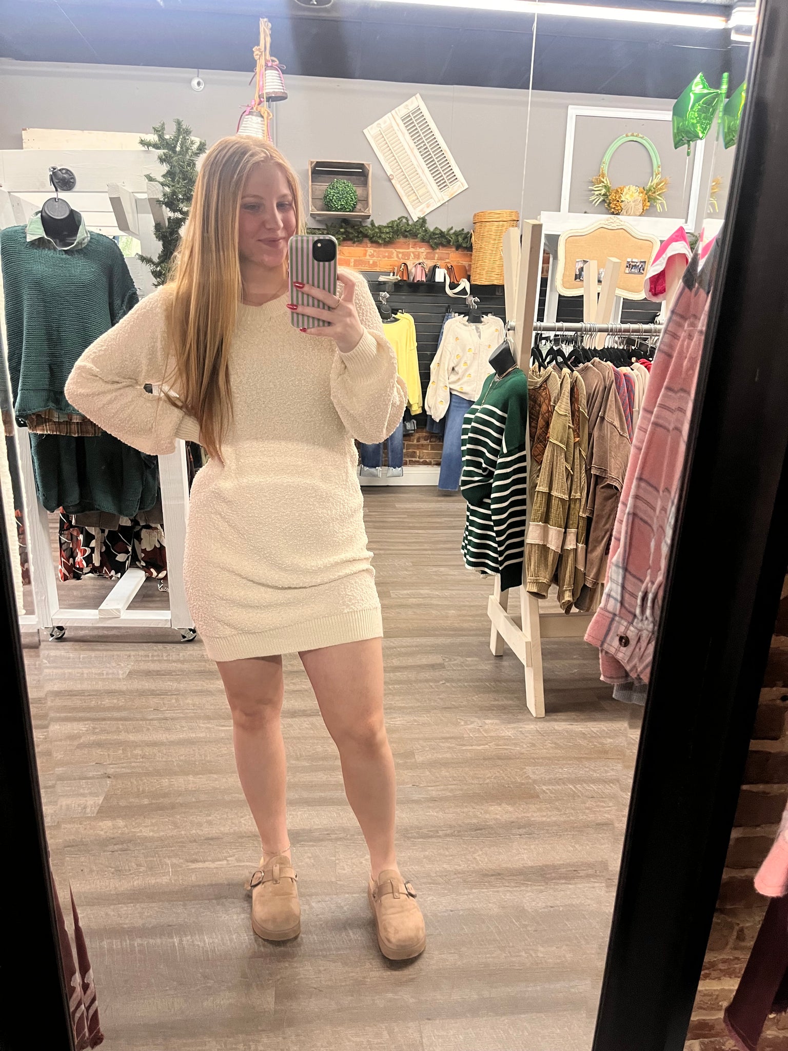 Round Neck Long Sleeve Sweater Dress with Ribbed HemFit & Model Notes:• Model is 5'9" and is wearing a small.• All Measurements are approximate.Fabric Contents:• Please refer to Care Label for wash instructions• 55% Polyester• 45% Acrylic