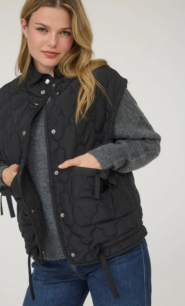 NECKLINE SLEEVELESS SNAP BUTTON DOWN POCKETS TIE DETAIL QUILTED PUFFER PATTERN LINED SOLID PUFFER VEST SHELL:100%POLYESTER LINING:100%POLYESTER FILLING:100%POLYESTER FIBERS