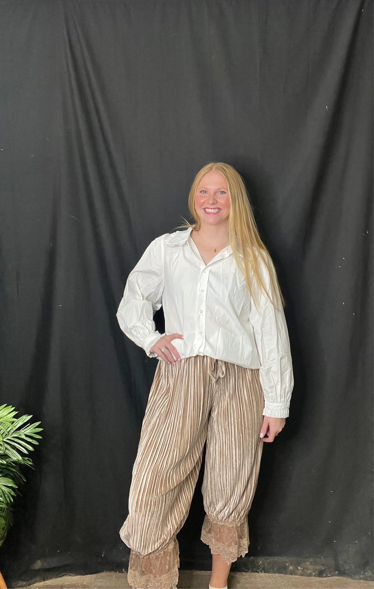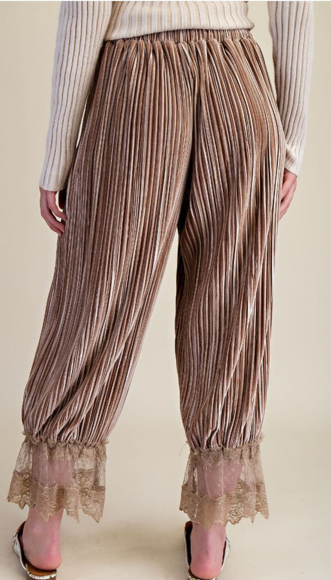 ICE VELVET CAPRI PANTS-RELAXED FIT-ELASTICIZED WAISTBAND WITH DRAWSTRING TIE-SHEER SCALLOPED LACE TRIM AT HEM-TAPERED SILHOUETTE-SMALL MEASUREMENTS : INSEAM - 22" OUTSEAM - 34" & WAIST - 14"