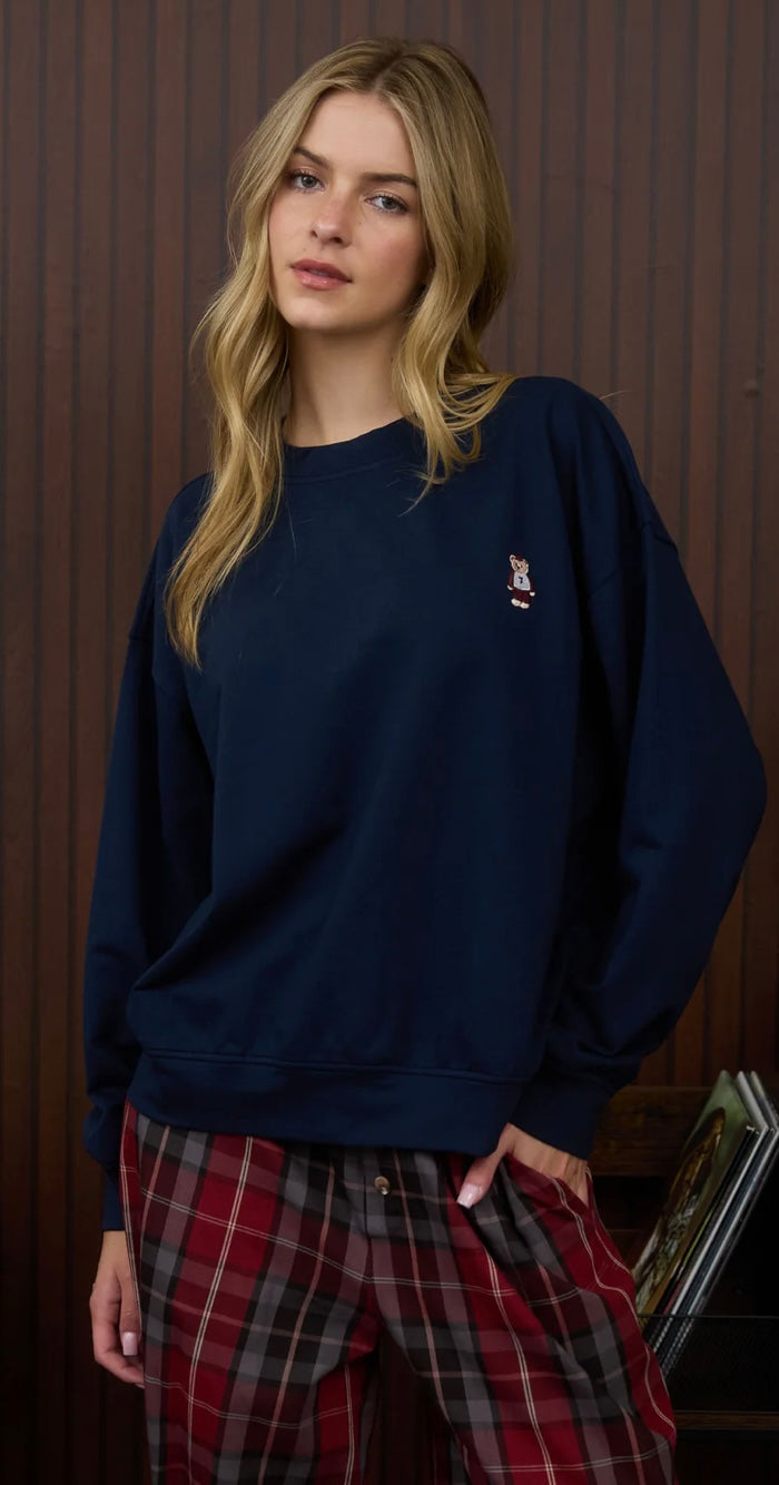 NAVY LONG SLEEVE TEDDY EMBROIDERY KNIT TOP