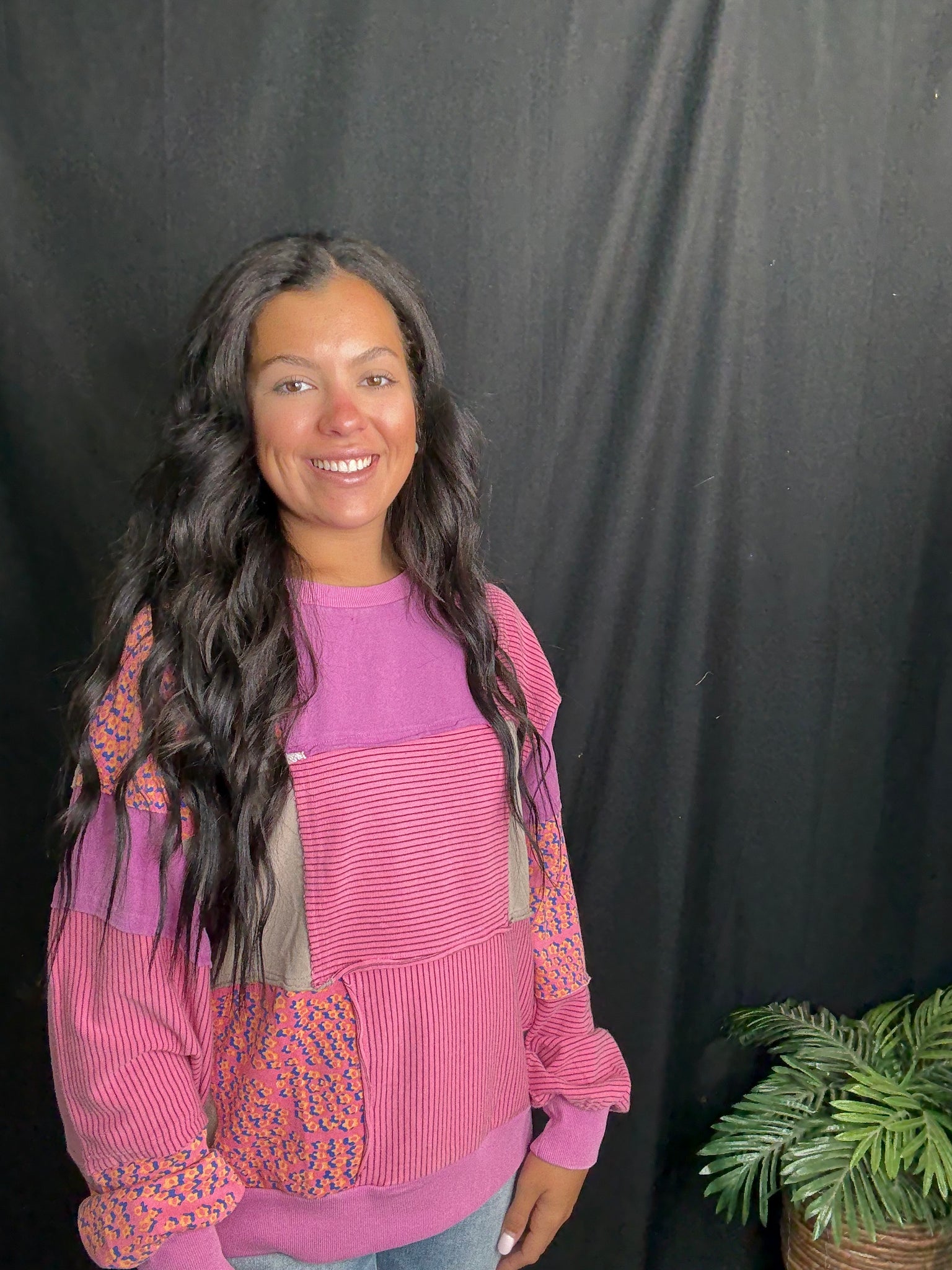 PATCHWORK WASHED TERRY PULLOVER-CREW NECKLINE-MINERAL WASHED-MULTI COLOR PATCHWORK DESIGN-COMBINATION OF STRIPED, AND FLORAL PRINTED-DROPPED SHOULDERS-OVERSIZED SILHOUETTE-ELASTICIZED RIBBED HEM