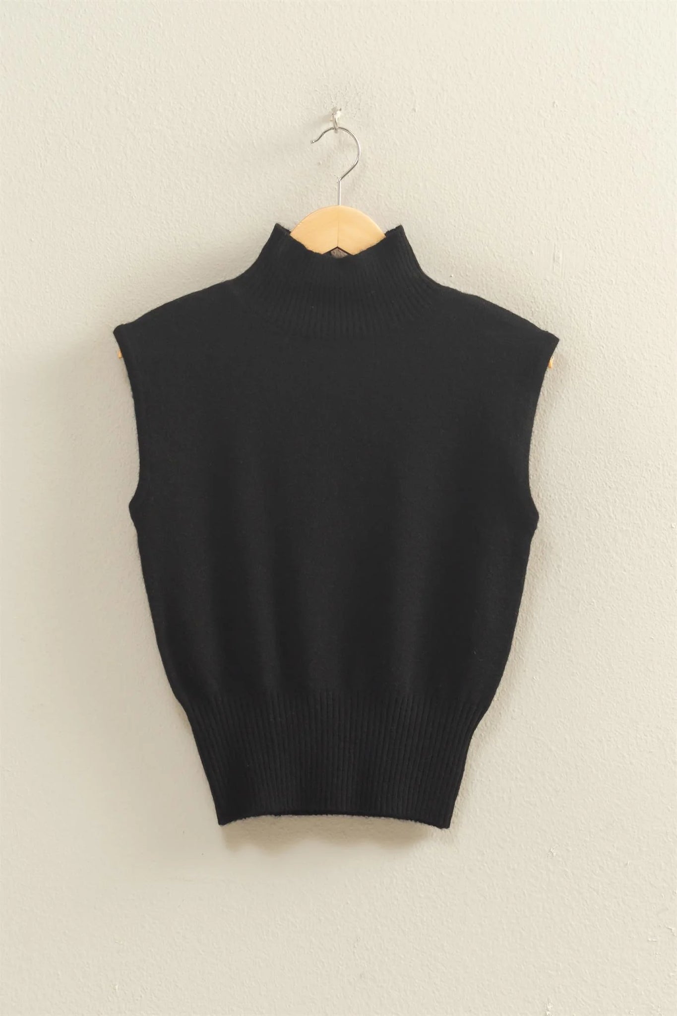 Embrace style with this sleeveless knit top featuring a fitted high neck and slightly extended shoulders for a relaxed, comfortable fit. The ribbed hem hugs the body for a sleek silhouette. Perfect for layering or wearing alone, it pairs effortlessly with skirts or trousers. Its minimalist design adds subtle sophistication, ideal for casual outings.