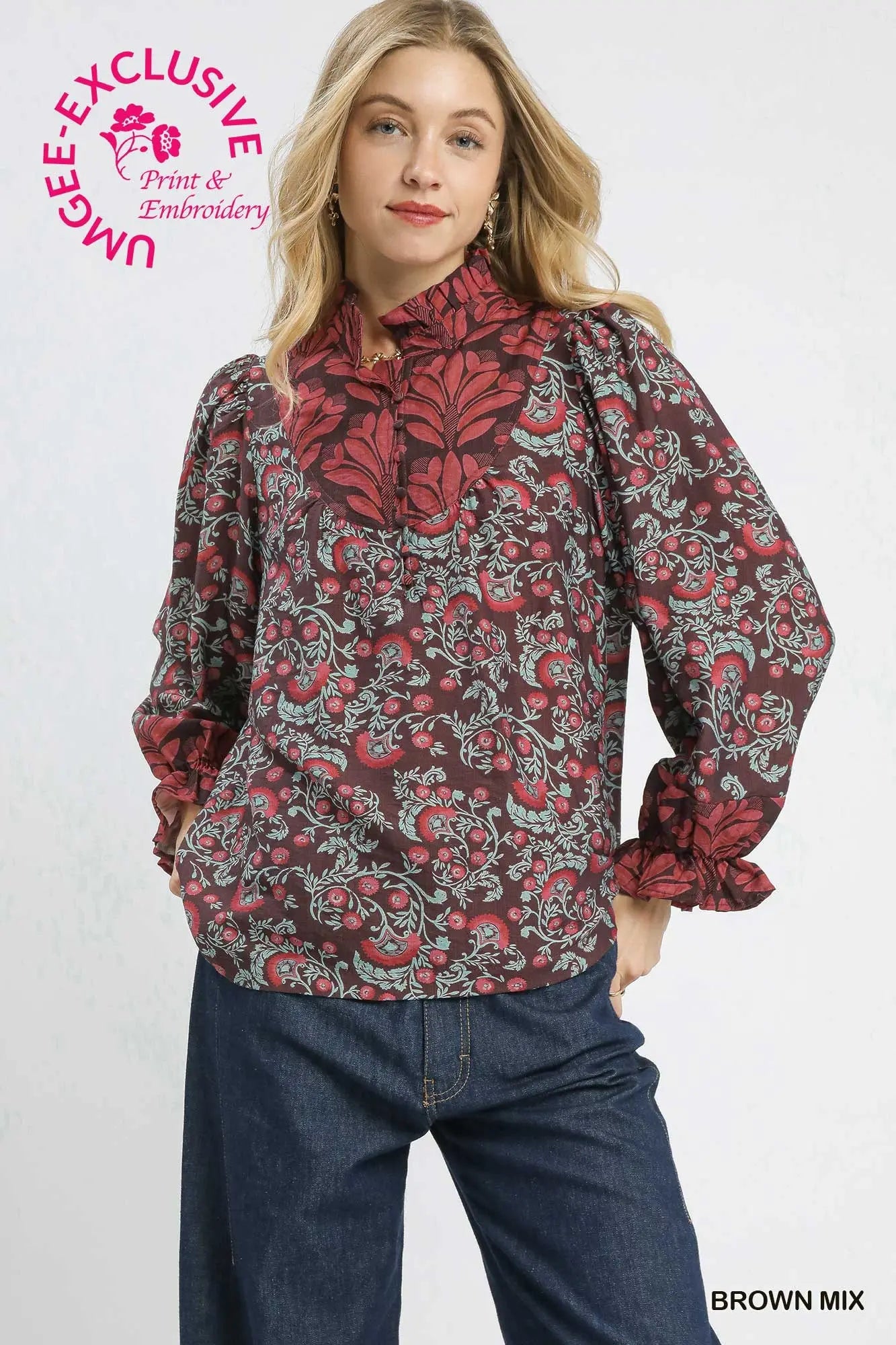 Brown Mix Ruffle Neck Top