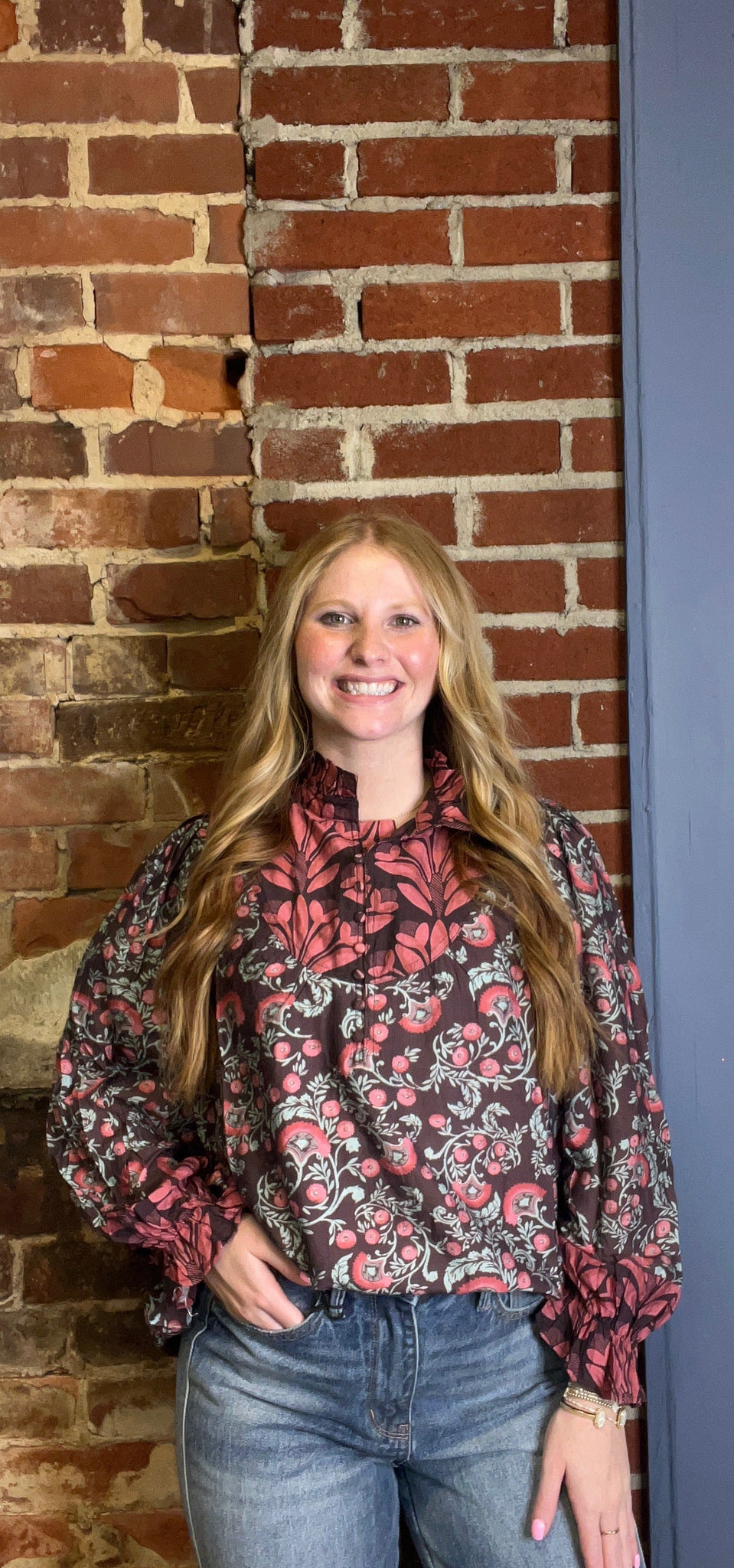 • Long puff sleeves with elasticized ruffle cuffs