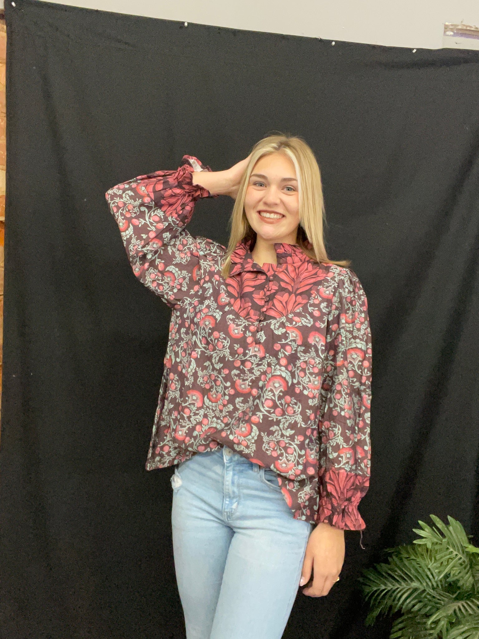 Mixed Print Ruffle Neck Top