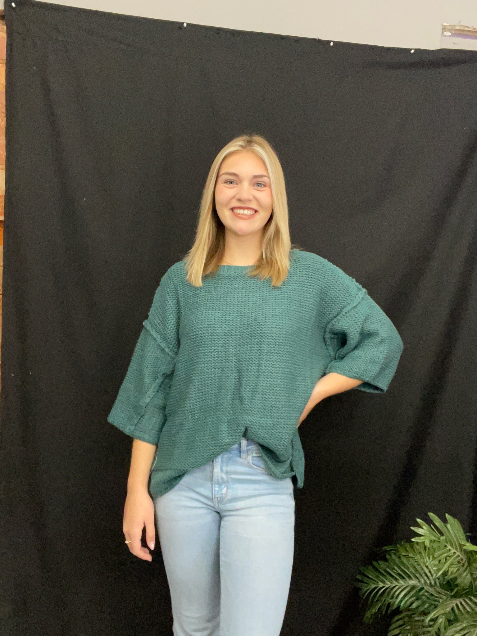 Description: 3/4 SLEEVES BOXY SWEATER TOP-RELAXED FIT, OVERSIZED SILHOUETTE-CHUNKY KNIT FABRIC-DROPPED SHOULDERS-WIDE 3/4 LENGTH SLEEVES-CREW NECKLINE-EXPOSED SEAMING*****AVAILABLE IN PLUS SIZE*****PLEASE CHECK AVAILABLE DATE*****