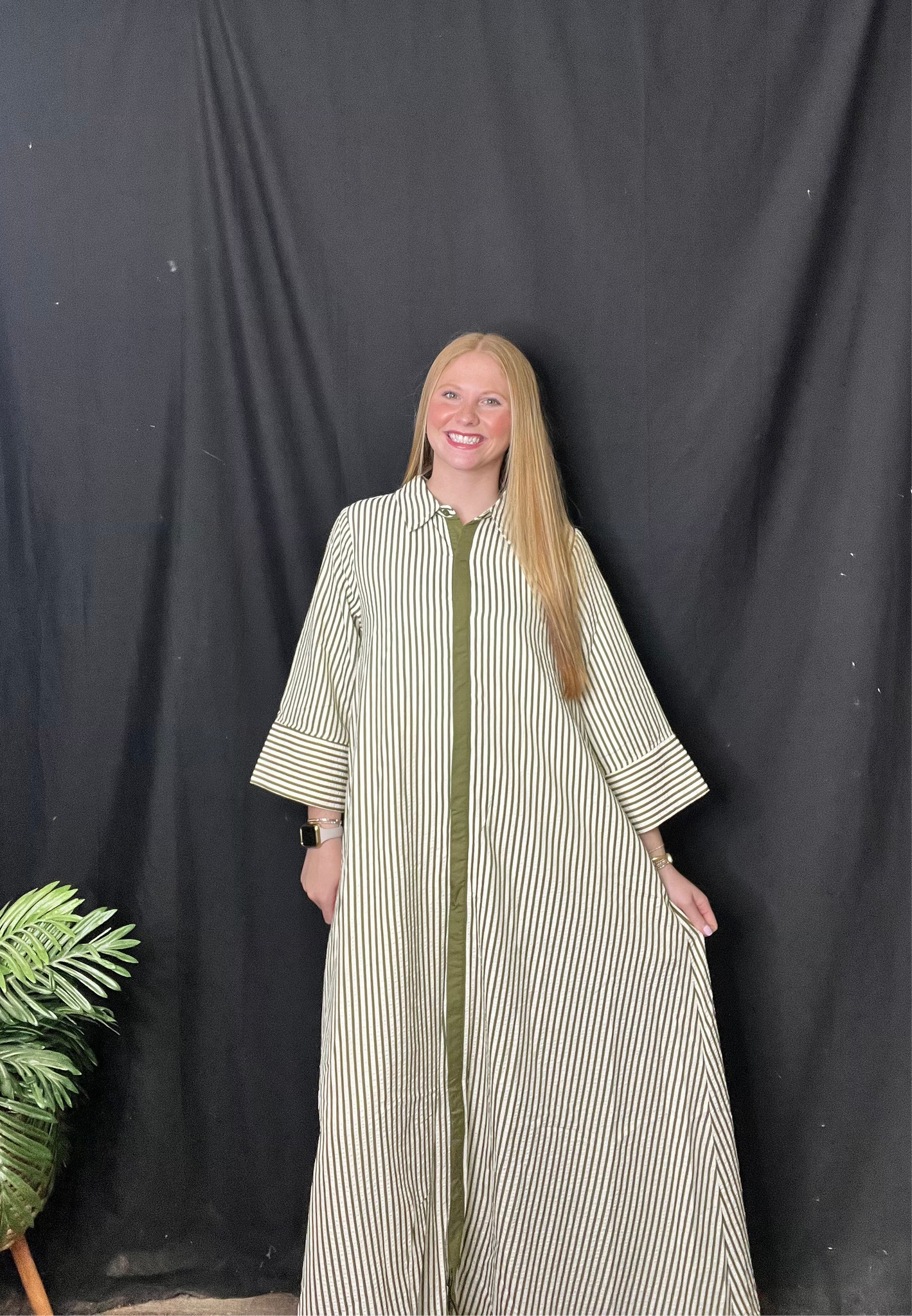 Striped 3/4 sleeve Midi dress featuring hidden button closure at front. Shirt collar. Side pockets. Unlined. Woven. Non-sheer. Lightweight.