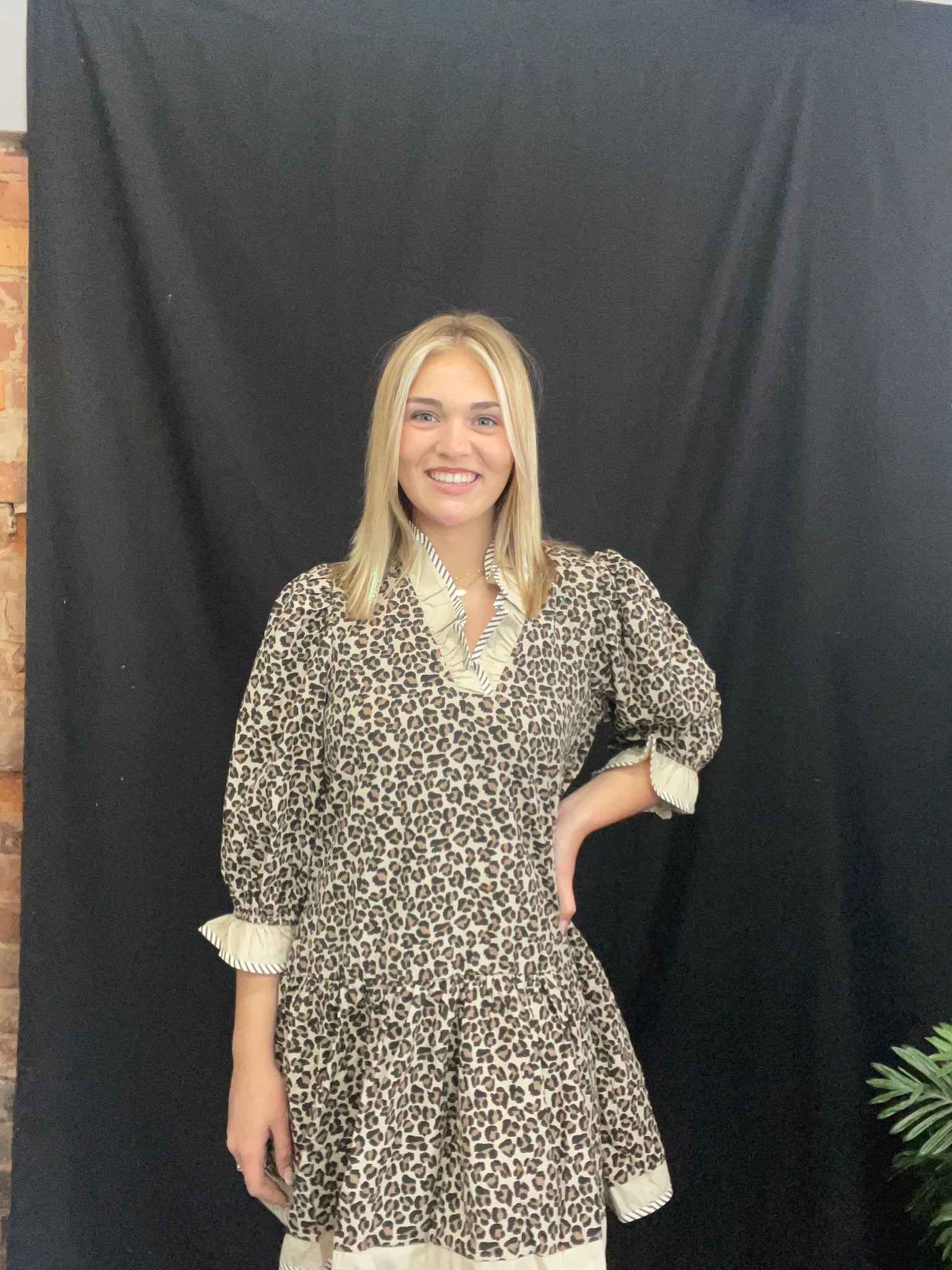 Animal print 3/4 sleeve mini dress featuring contrast ruffle trim V-neck. Side pockets. Lined. Woven. Non-sheer. Lightweight.