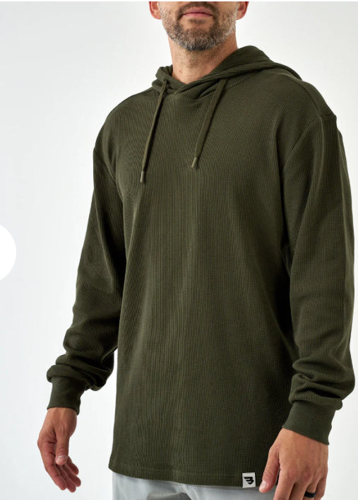 Thermal Hoodie from the Fall 25' Collection, made with a soft cotton blend and waffle knit texture for lightweight warmth and breathable comfort. Designed with a relaxed fit that’s perfect for wearing on its own or layering under a jacket. Finished with an easy pullover hood for casual, everyday wear.